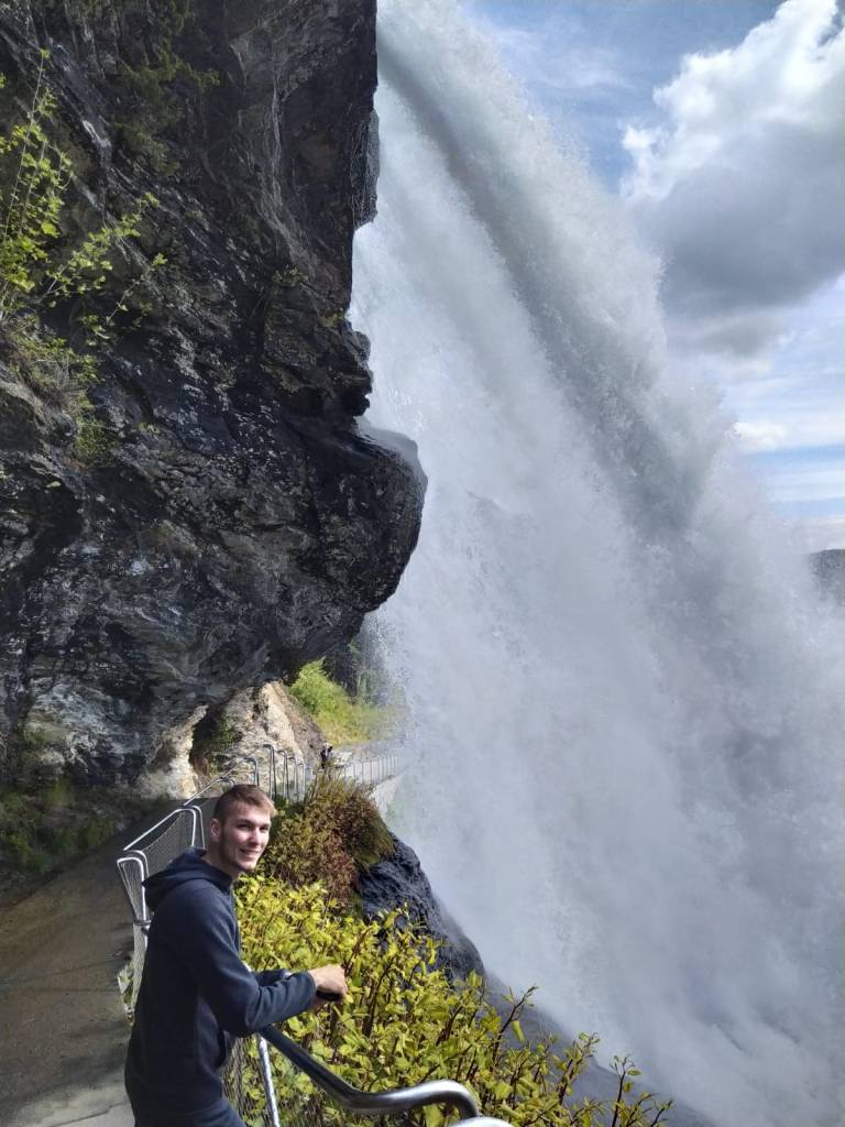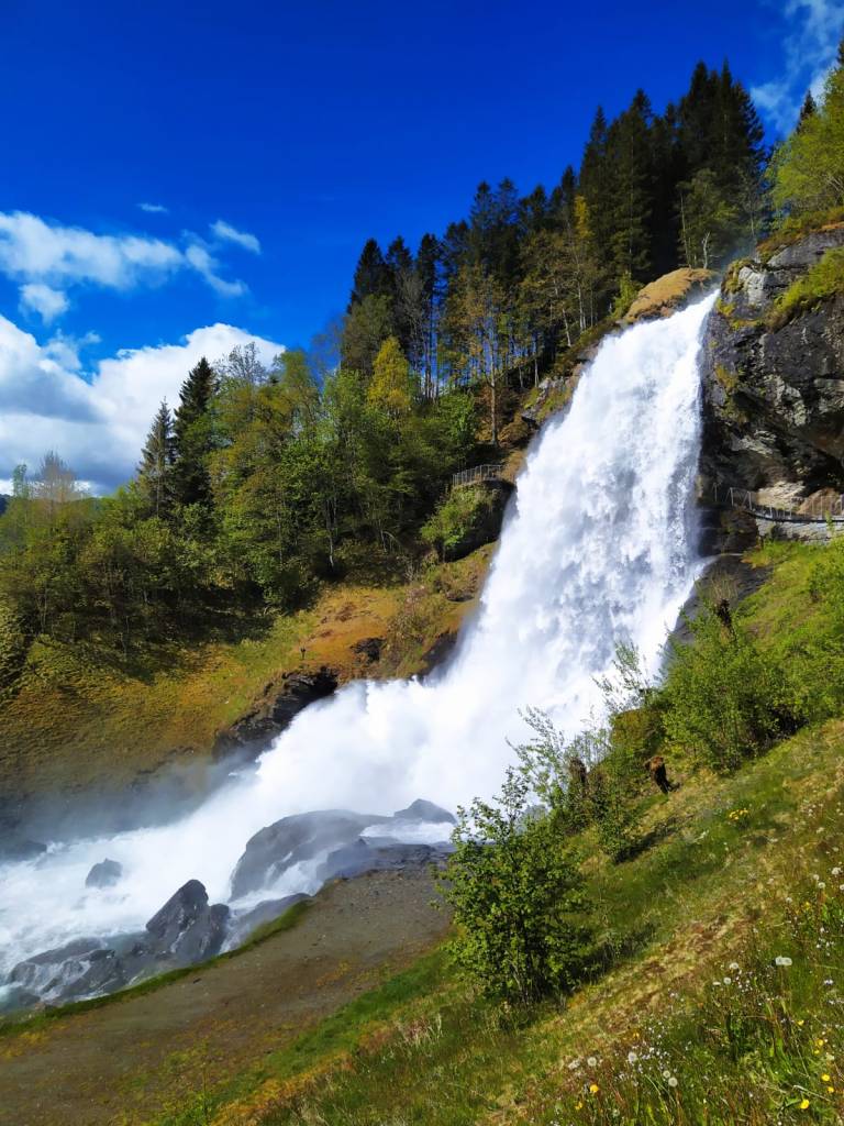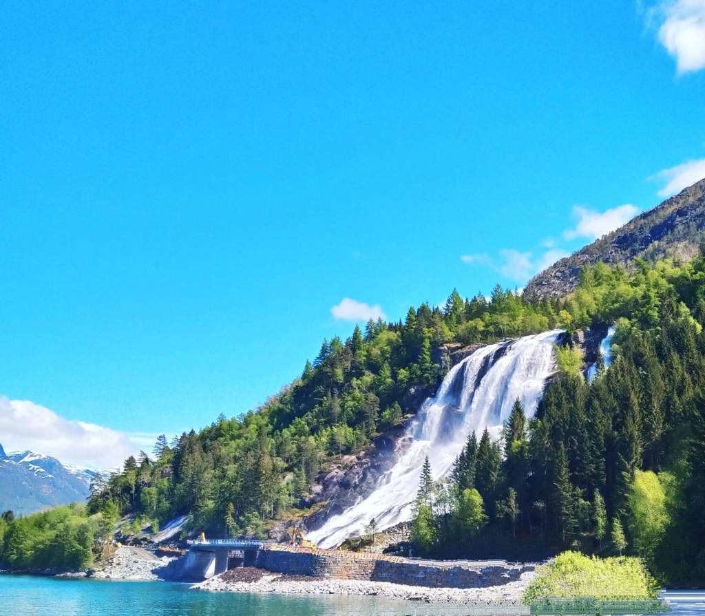 Brzy ráno si půjčujeme auto v Åsane od společnosti Hertz a vyrážíme na cestu. Jelikož je okolí krásného Hardangerfjordu protkáno desítky vodopádů, takže hned za pár minut zastavujeme u prvního velkého vodopádu – Fossen Bratte. Krásný mohutný vodopád, ke kterému se můžete dostat jak zespoda, tak zeshora. Na místě můžete v klidu s autem zastavit a k dispozici je i chatka s WC. Dalším nádherným a hodně známým vodopádem po cestě je Steindalsfossen, který je populární nejen pro svou krásu, ale hlavně proto, že ho lze podejít po vyhlídkové cestě.