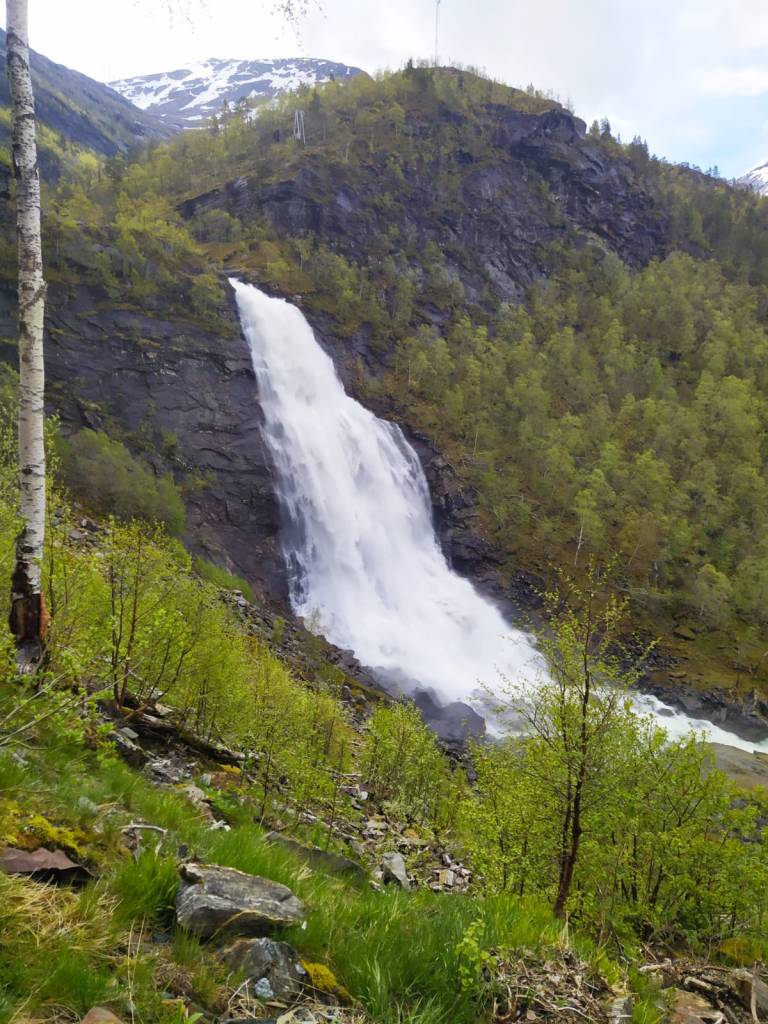 Pokračujeme po scénické silnici směrem k městu Voss. Po cestě se stále někde zastavujeme na krásné výhledy nebo vodopády – Skjervefossen, krásný mohutný vodopád, kolem kterého vedou kamenné schody.