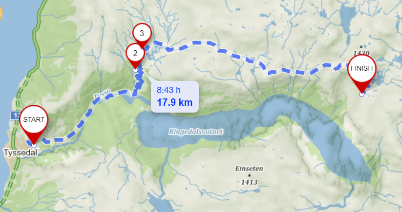- Nejkratší možný hike k cíli a zpět dává dohromady cca 20 km -> pořádná obuv nutná (z Tyssedalu a zpět jsme naměřili přes 40 km chůze).