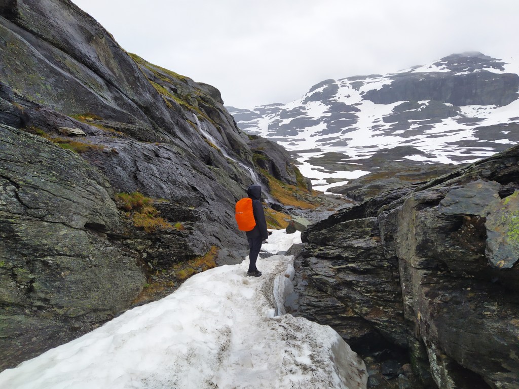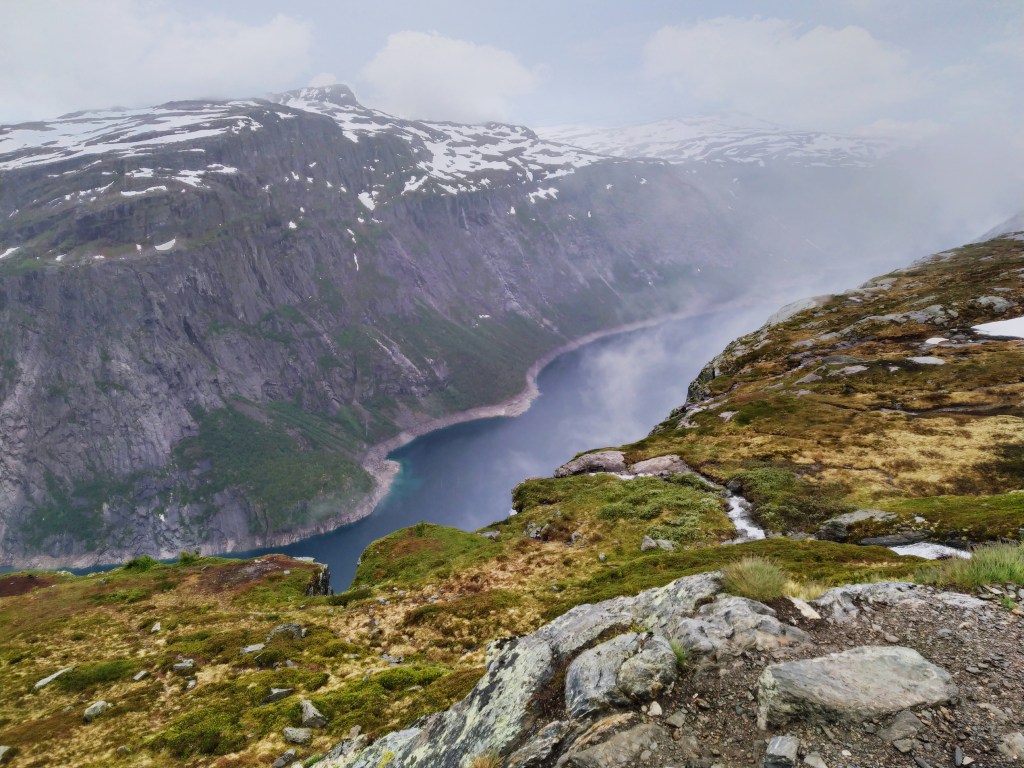 Po výšlapu kopečku se dostanete přibližně do výšky 1000 m.n.m. a odsud začíná pravý 20 km dlouhý (10 tam) hike k výběžku Trolltunga. Cesta je díky obřímu každoročnímu náporu turistů dost vyšlapaná, upravená, často jdete po kamenitých schodech. Je důležité mít na paměti, že se celý hike odehrává ve vysoké nadmořské výšce, takže je tam o dost chladněji než dole a i v létě můžete narazit na sníh (my si ho tam užili dost).