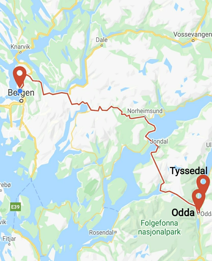 Vyrazili jsme přesně v poledne ze zastávky Handelshøyskolen (hned u kolejí) autobusem č. 930 směr Odda. Tento bus je jedinný MHD přímý spoj do Oddy a cesta trvá necelé 3 hodiny, takže se člověk celkem projede. Na Odda Busstasjon pak přestoupíte na bus do Tyssedalu, odkud se vyráží na Trolltungu. Doporučujeme vzít takový autobus, který vás doveze co nejblíž k hiku – na zastávku Skogly (my jeli až tam s č. 995).