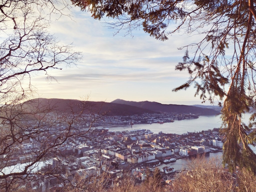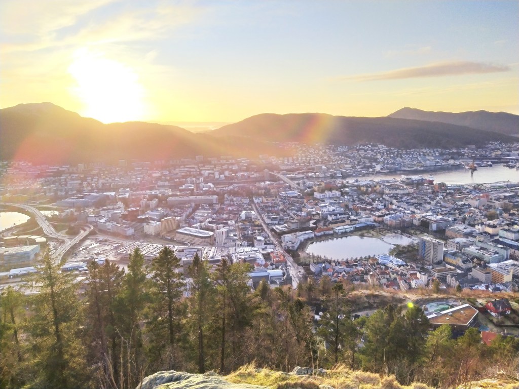 Úplně první výšlap na jednu z bergenských hor byl zorganizovaný studenty NHH během welcome weeku. Po krátké prohlídce centra města jsme vyrazili po asi nejfrekventovanjší trase na vyhlídku Fløyen. Ze začátku tato cesta nevypadá úplně jako cesta, jde se v úzkých uličkách a po schodech mezi hezkými dřevěnými domky. Po té, co jsme se dostali k malému rybníčku a kostelíku v parku Skansedammenpark, se nám naskytla první vyhlídka na město.