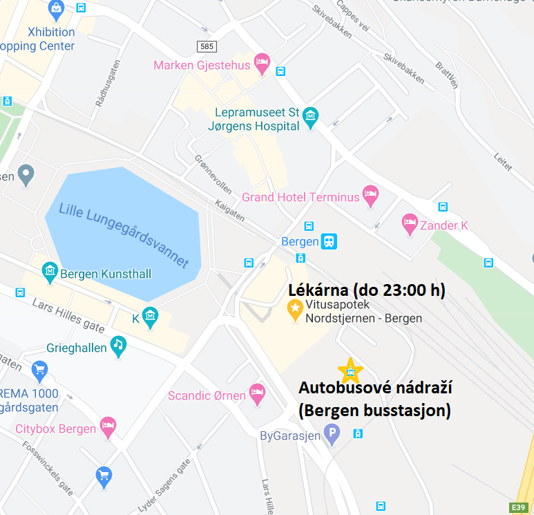 Obě výše zmíněné nemocnice mají lékárny ve svém areálu nebo poblíž. Bohužel mají jen do 17:00 (u Legevaktu) a 18:00 (Haukeland). Pokud to nestihnete (stejně jako my v 10 večer), je ve městě lékarna, která má otevřeno do 23:00 každý den. Nachází se u autobusového nádraží v jednom obchodním centru. Po nějaké hodině už má otevřené jen “okénko”, u kterého si koupíte, co potřebujete, nebo pokud máte léky na předpis, předáte ho spolu s vaší ID kartou (předpis je na jméno).