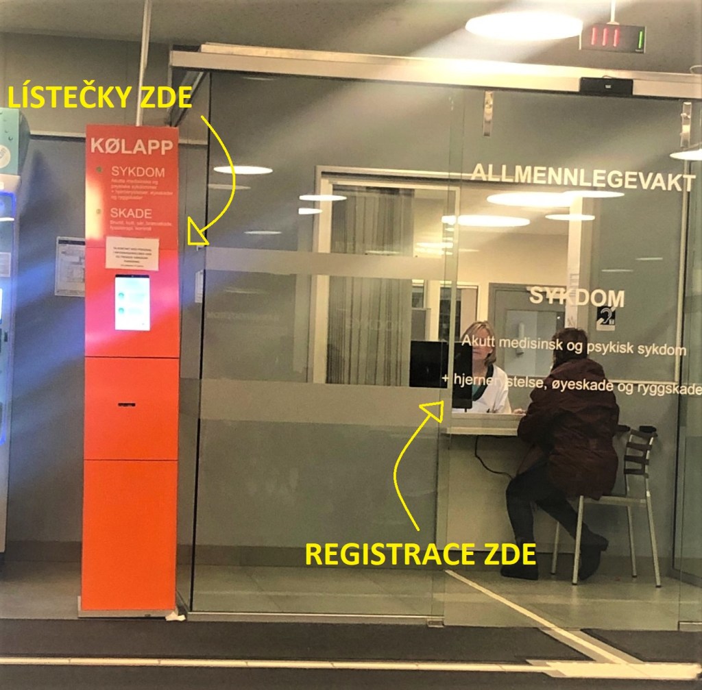 Když vejdete dovnitř, dostanete se do velké vstupní haly. Musíte si jít nejprve pro pořadový lístek, tak jako třeba na poště nebo v bance, a zvolit si mezi Sykdom (nemoc) a Skade (zranění). Potom čekáte, až se rozsvítí vaše číslo pro vstup do takové prosklené budky na registraci a pro zjištění vašich problémů. Tam si o vás všechno zapíšou a dají vám nějakou prioritu, zejména podle toho jakou máte teplotu a jak moc na umření vypadáte. Potom čekáte, až sestřička vyvolá vaše jméno, jdete do části, kde jsou malé ordinační místnosti. Vždy vám změří tlak, znovu teplotu a diskutují s vámi vaše problémy. Potom vám případně odeberou vzorky krve (pokud máte urologické potíže, moč už musíte mít připravenou před tím, než vás sestřička zavolá, kelímek dostanete při registraci). Po vyhodnocení vzorků přichází lékař.