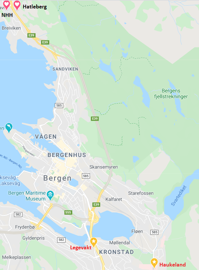 Bergen Legevakt a Haukeland universitetssjukehus (Univerzitní nemocnice Haukeland) jsou další nemocnice, které můžete využít. Legevakt se nachází asi 25 minut busem a 5 minut pěšky od kolejí Hatleberg, do Haukeland to trvá jen asi o 5 minut déle. Jejich velkou výhodou je nepřetržitý provoz, tedy najdete zde pomoc 24 hodin denně. Tyto dvě centra jsou asi největší v Bergenu, samozřejmě je zde rozmístěno mnoho dalších menších klinik, ty ale nebývají non-stop.