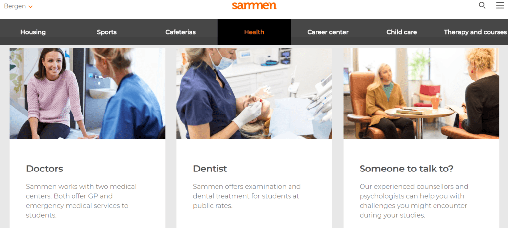 Sammen (správa kolejí a jiných zařízení v Bergenu) spolupracuje s několika zdravotními centry, zubaři, ale i poradnami. Co se týče klasické zdravotní péče spolupracuje s nemocnicemi 7 Fjell Medical centre a Legene på Høyden a jednou zubní ambulancí, sídlící nedaleko 7 Fjell MC. Navíc Sammen zaměstnává několik psychologických poradců a psychologů.