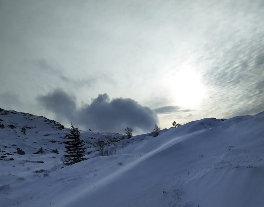 Od jezera nás pak čekal výšlap a náročná cesta ve sněhových závějích, počasí se zhoršilo a nebylo vidět na 5 metrů, takže jsme často scházeli ze stezky, i když byla označena vysokými sloupy. Takto jsme šli asi 7 km, pár našich pronásledovatelů to dokonce vzdalo. Ale my jsme vydrželi a byli jsme odměněni změnou počasí, zlepšila se viditelnost a mohli jsme se kochat výhledy na překrásné hory v okolí, sem tam jsme narazili i na nějakou chatku u jezírka.