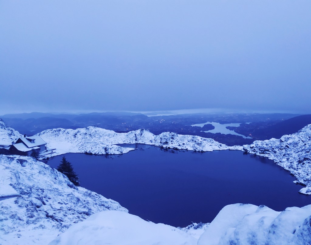 Po asi půlhodině trápení jsme konečně došli na vrchol další ze sedmi bergenských hor, Rundemanen. Celá hora byla pokryta sněhem a počasí bylo překrásné. Přes tuto horu vede stezka zvaná Videnn, která vede přímo na Ulriken, a tak jsme se na ni napojili. Kromě krásného výhledu a přírody můžete na Rundemanen vidět i válečné bunkry a spoustu horských chat.